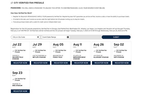 Once you've accessed the Citibank Presale Beyonce platform, you'll be prompted to enter your Citibank card details. This is to verify your eligibility for the presale and ensure that only Citibank cardholders can take advantage of this exclusive offer. Once your card is verified, you'll gain access to the presale and be able to browse through the available ticket options.